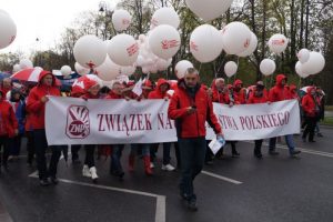 18 kwietnia 2015 roku. Kolumna związkowców ZNP wyrusza spod „Torwaru”. Na czele kolumny Prezes ZNP Sławomir BRONIARZ. Wśród prezesów współprowadzących kolumnę był również Prezes Rady Szkolnictwa Wyższego i Nauki ZNP, Prezes ZNP w Politechnice Częstochowskiej dr inż. Janusz RAK (trzeci od lewej).
